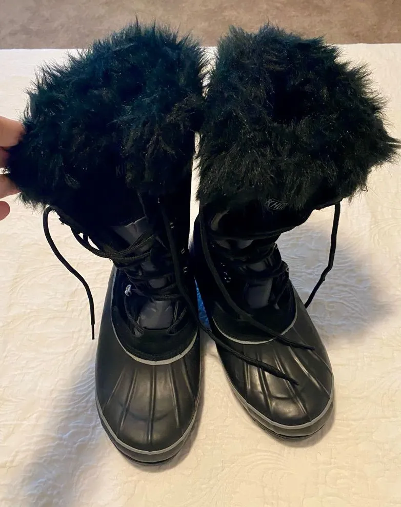 Cold-weather ready with a cozy, rugged feel. These Khombu black snow boots feature a faux fur–trimmed collar, lace-up front, and durable rubber duck-style toe designed for winter conditions. Quilted side panels and a sturdy traction sole make them practical without sacrificing style. Great for snow days, cold commutes, or casual winter wear. Details: • Brand: Khombu • Size: Women’s 10 • Color: Black • Lace-up winter snow boots • Faux fur trim and lining • Rubber duck-style waterproof lower • Quilted side panels • Textured traction sole Condition: Good pre-owned condition with light signs of wear. Soles show normal use. No cracks or major flaws noted. Please review photos for overall condition. Warm, functional, and easy to wear — a solid winter staple.