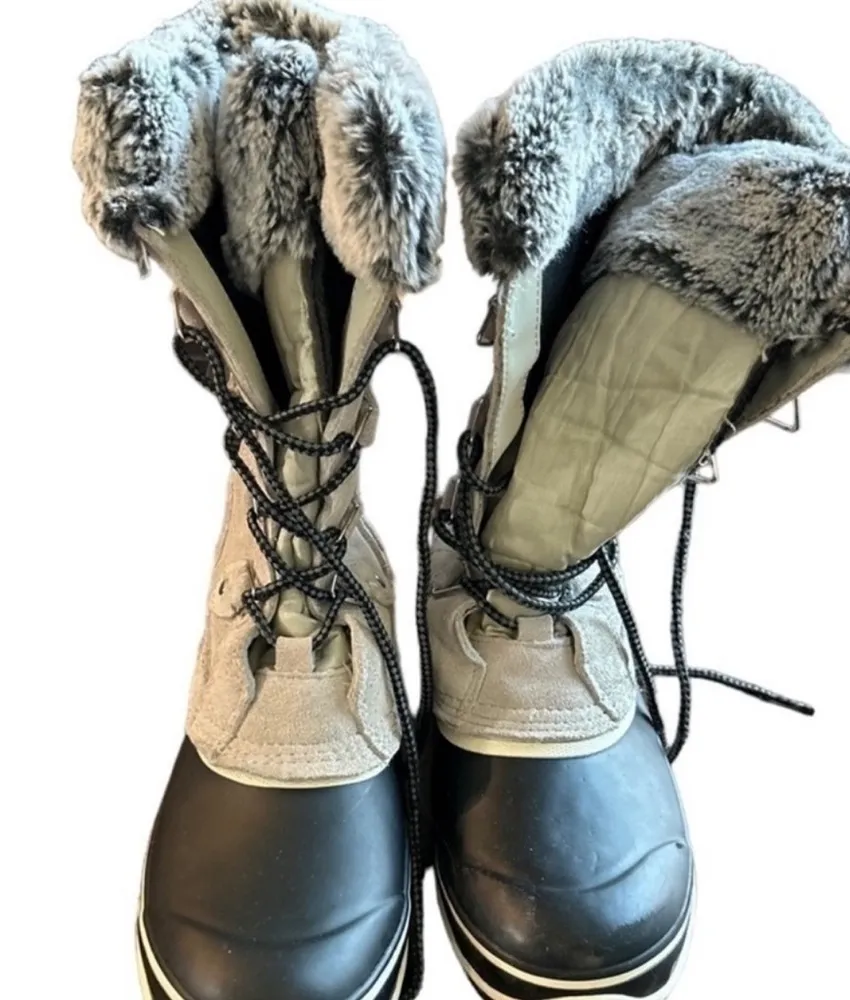 The Khombu women's snow boots are designed for casual winter wear. Made from gray suede leather with a faux fur lining, these boots offer warmth and comfort. They feature a waterproof design and a lace-up closure, making them suitable for snowy conditions. The round toe shape adds to the comfort, ideal for everyday winter activities. These boots are pre-owned. Keywords: Khombu, women's snow boots, suede leather, faux fur, waterproof, lace-up, winter boots, casual wear, gray boots, pre-owned, round toe, winter theme, snow theme, women's footwear, winter season. Brand: Khombu Us shoe size: N/A Style: Snow Boot Color: Gray Department: Women Upper material: Suede Leather Lining material: Faux Fur Theme: Winter, Snow Occasion: Casual Features: Waterproof, Lace-up Type: Boot Toe shape: Round Toe Season: Winter Closure: Lace Up