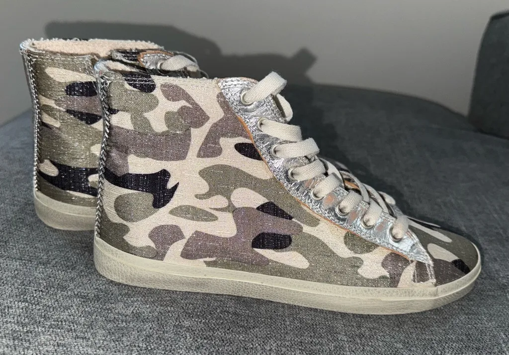 Stylish high-top sneakers with a camouflage pattern. Features a mix of green, tan, and brown colors. ▪️ Excellent used condition. ▪️ The pictures are an important part of the description, please check them out carefully before you buy. You'll get what you see in the pictures. ▪️ Colors shown on-screen can vary from computer to computer. I make every effort to photograph each item individually and list with accuracy. ▪️ Classic, timeless, travel, weekend, vacation, everyday, easy, versatile, iconic, resort, sporty, laidback, effortless, throw on and go, comfortable, casual, work, business, office, wear, event, special occasion, social, show, gathering, rehearsal, basic, essential, staple Thank you XOXO - KA