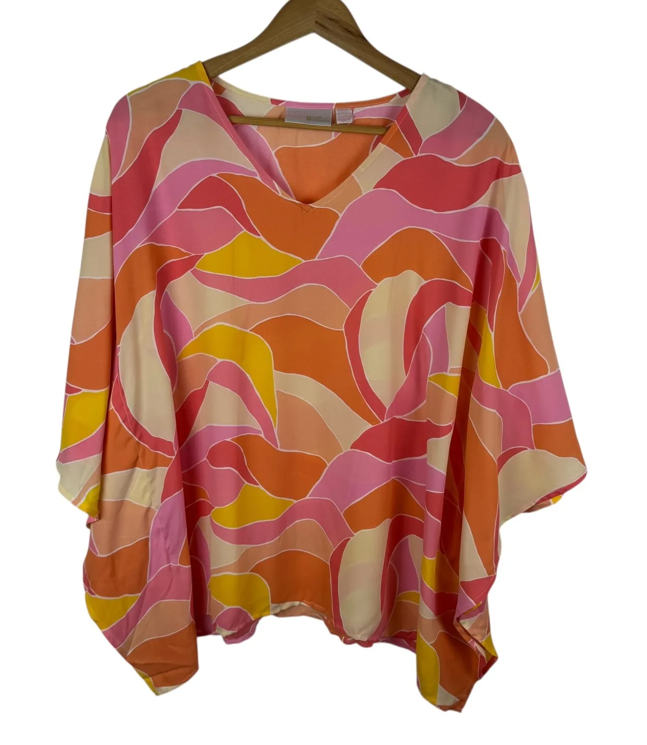 Eye-catching caftan blouse by Kim Gravel Belle, featuring an abstract wave print in shades of pink, orange, and yellow. This relaxed-fit top has a flattering V-neck and short sleeves, creating a breezy and comfortable silhouette. The vibrant colors and bold pattern make this top a standout piece that's sure to turn heads. Perfect for resort wear, casual outings, or adding a pop of color to your everyday wardrobe. Color: Multicolor Type: Blouse Department: Women Style: Kimono Material: Polyester Neckline: V-Neck Sleeve Length: Short Sleeve Sleeve Type: Kimono Sleeve Pattern: Geometric Features: Relaxed Fit, V-Neck, Lightweight, Sheer, Breathable Fit: Relaxed Keywords: Kim Gravel Belle, Caftan Top, Abstract Print, V Neck Blouse, Pink Orange Yellow Top, Resort Wear Top, Bohemian Blouse, Casual Top, Womens Top, Short Sleeve Blouse, Relaxed Fit Top, Summer Top, Boho Top, Colorful Blouse, Abstract Top, QVC Top, Medium Blouse, Retro Print Top, Abstract Wave Blouse, Summer Tunic, Vacation Top, Festival Blouse, Bright Multicolor Top, Resort Wear, Boho Chic, Flowy Blouse, 70s Inspired Style, Casual Chic Excellent Pre-Owned Condition (see pics for details) Flaws: No visible flaws. Measurements: included in photos. Please compare the measurements to something you already own for a great fit! Fast shipping: Shipped out next business day! Please let us know if you have any questions!