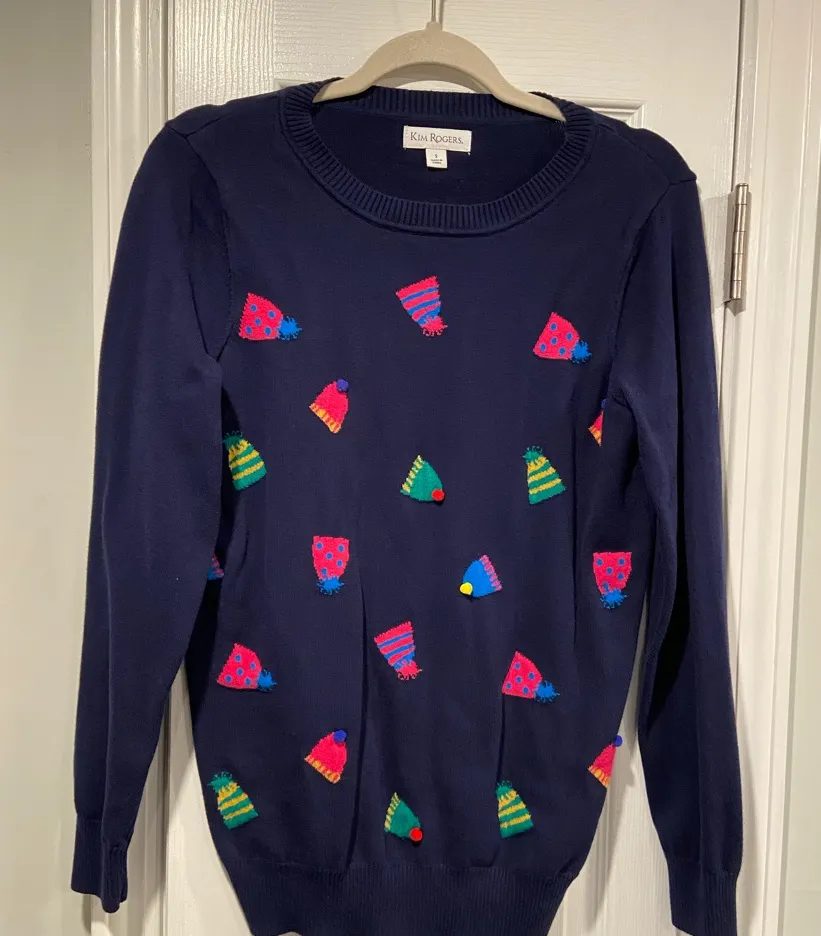 Kim Rogers Size S Navy Crew Neck Holiday Sweater Winter Hat Pom Pom Cotton Blue - $25 - From Lindsey