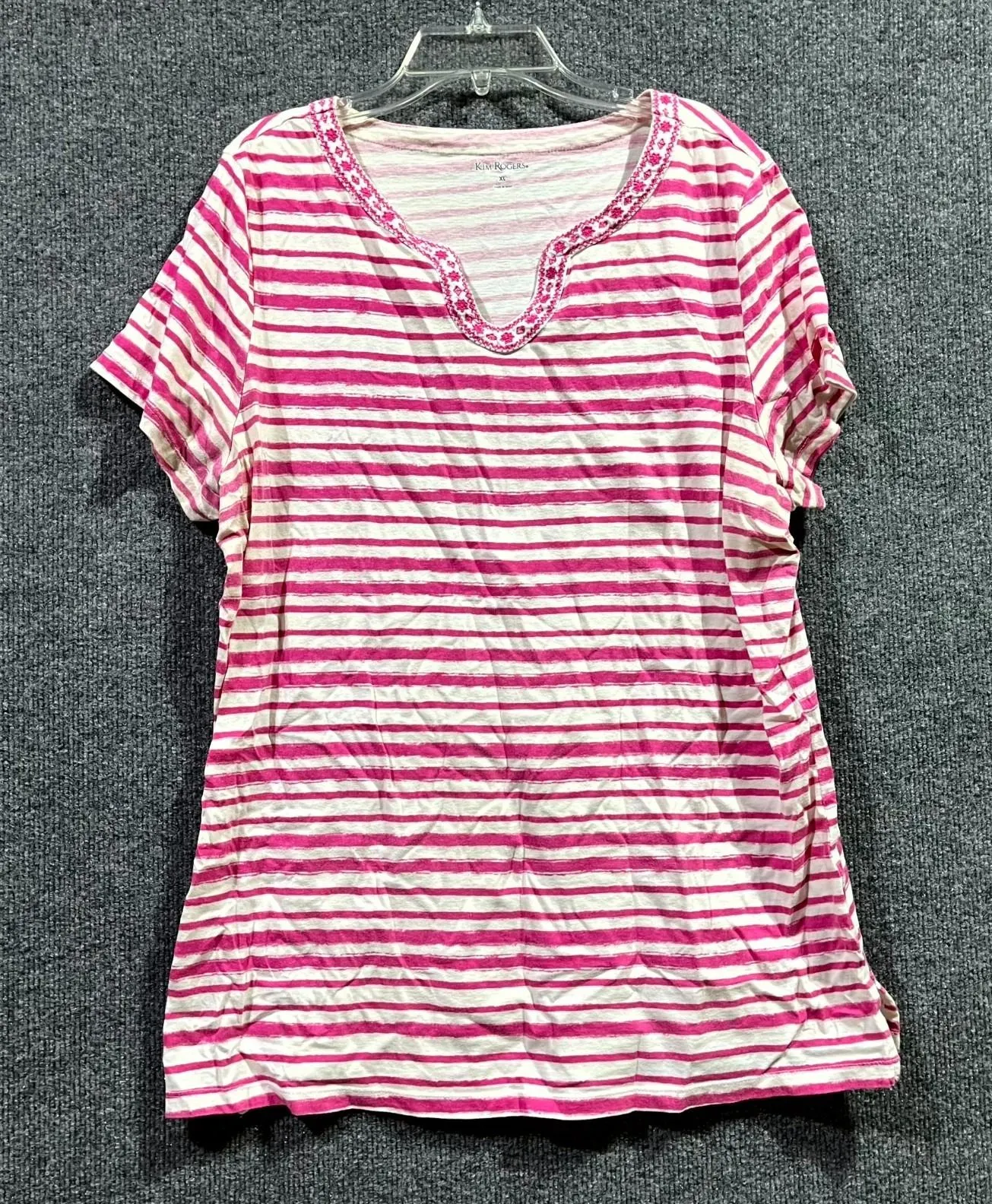 Description Kim Rogers T Shirt Womens XL Pink White Stripes Cotton Embroidered Casual V Neck. Product Detail • Brand: Kim Rogers • Department: Womens • Color: Pink White • Type: T Shirt Please message me if you have any questions. Please check photos above for measurements.