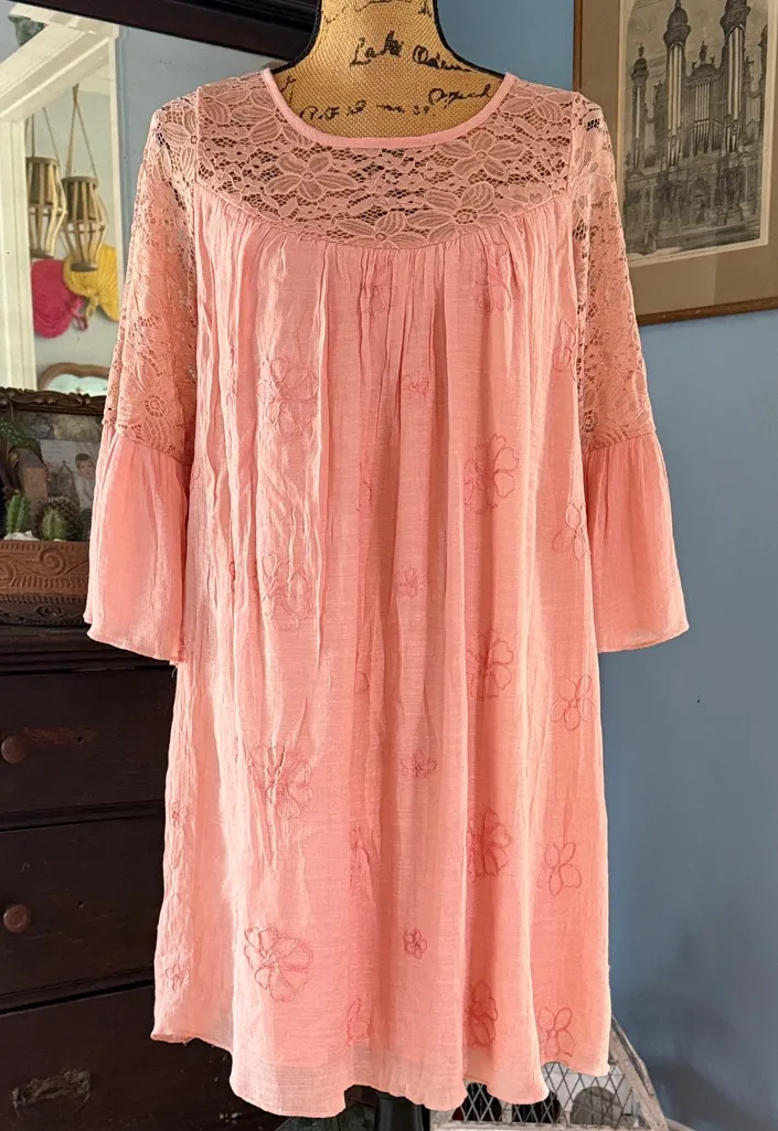 Dreamy, romantic boho dress by Kings Road in the prettiest dusty pink. Features a beautiful floral lace yoke across the chest and back, with sheer lace detailing through the sleeves for an airy, feminine feel. The body is lightweight and flowy with delicate embroidered floral accents throughout. Lined. In EUC. ✨ Details: • Brand: Kings Road • Size: Small • Color: Soft blush / dusty pink • Floral lace yoke (front & back) • Sheer lace bell sleeves • Lightweight, flowy silhouette • Boho / romantic / cottagecore vibe Laying flat appx: Pit to pit 18.5” Waist 23” Length 35”