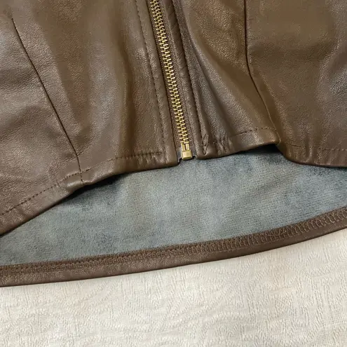 Stylish Kirious Los Angeles women’s crop top in a rich brown faux leather finish, designed with a sleek sleeveless cut and a back zip closure that adds a modern, edgy touch. This size Small top offers a structured yet flattering silhouette that pairs effortlessly with high-waisted jeans, trousers, or skirts for a bold day-to-night look. In very good pre-owned condition with no noticeable flaws, it’s a statement piece that elevates any outfit with minimal effort.