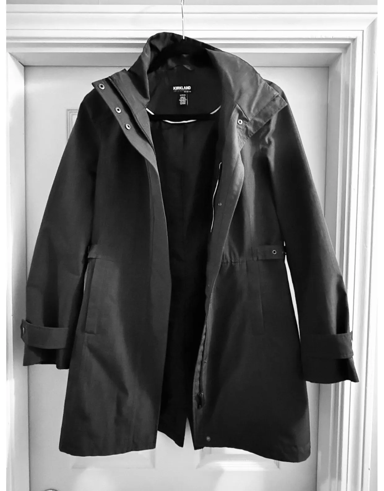 Kirkland Women's Size Small Hooded (Removable) Water Resistant Adjustable at waist Trench Coat Style Rain Jacket Charcoal Gray Excellent condition! No tears,rips, or stains! Smoke free home