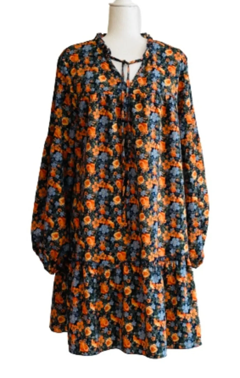 Kirundo Blue Orange Floral Tie Neck Long Sleeve Ruffled Boho Casual Swing Above the Knee Dress Siz... Show more