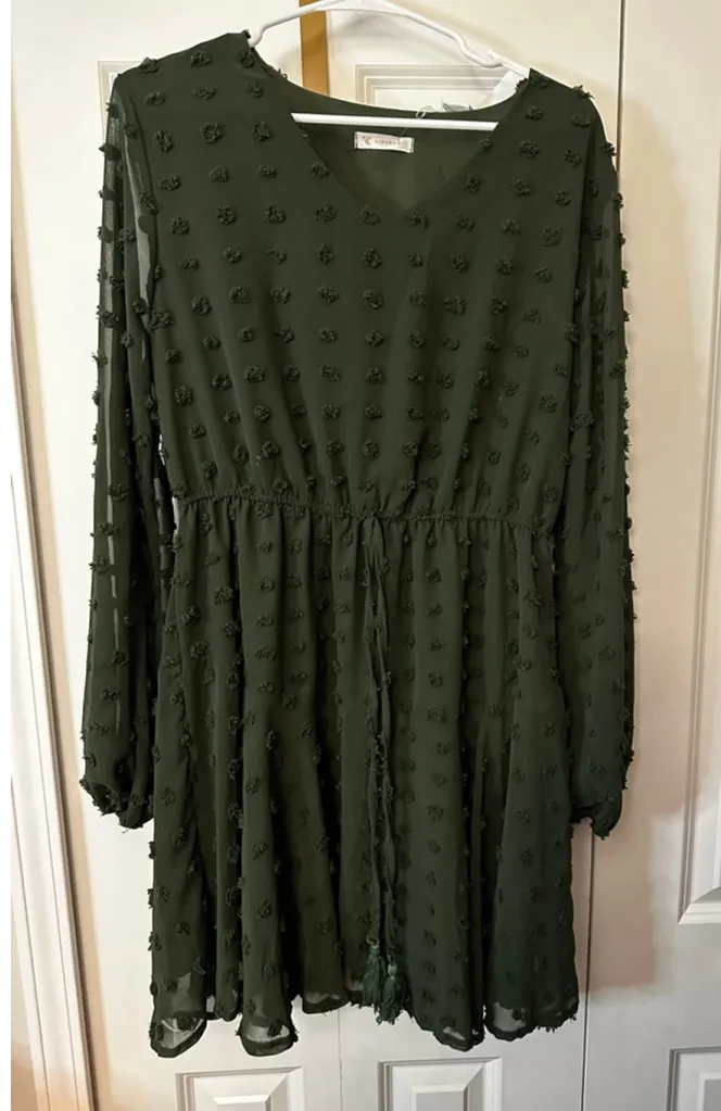 This pre-owned KIRUNDO women's long-sleeve dress in size L features a dark green color with an all-over textured pom-pom detail. The dress has a V-neckline, elasticated waist with an adjustable drawstring and tassel ends, and a flared skirt. The sleeves are sheer with elasticated cuffs. The garment is made from 100% polyester for both the shell and lining, and is labeled as "MADE IN CHINA." No significant imperfections are visible.