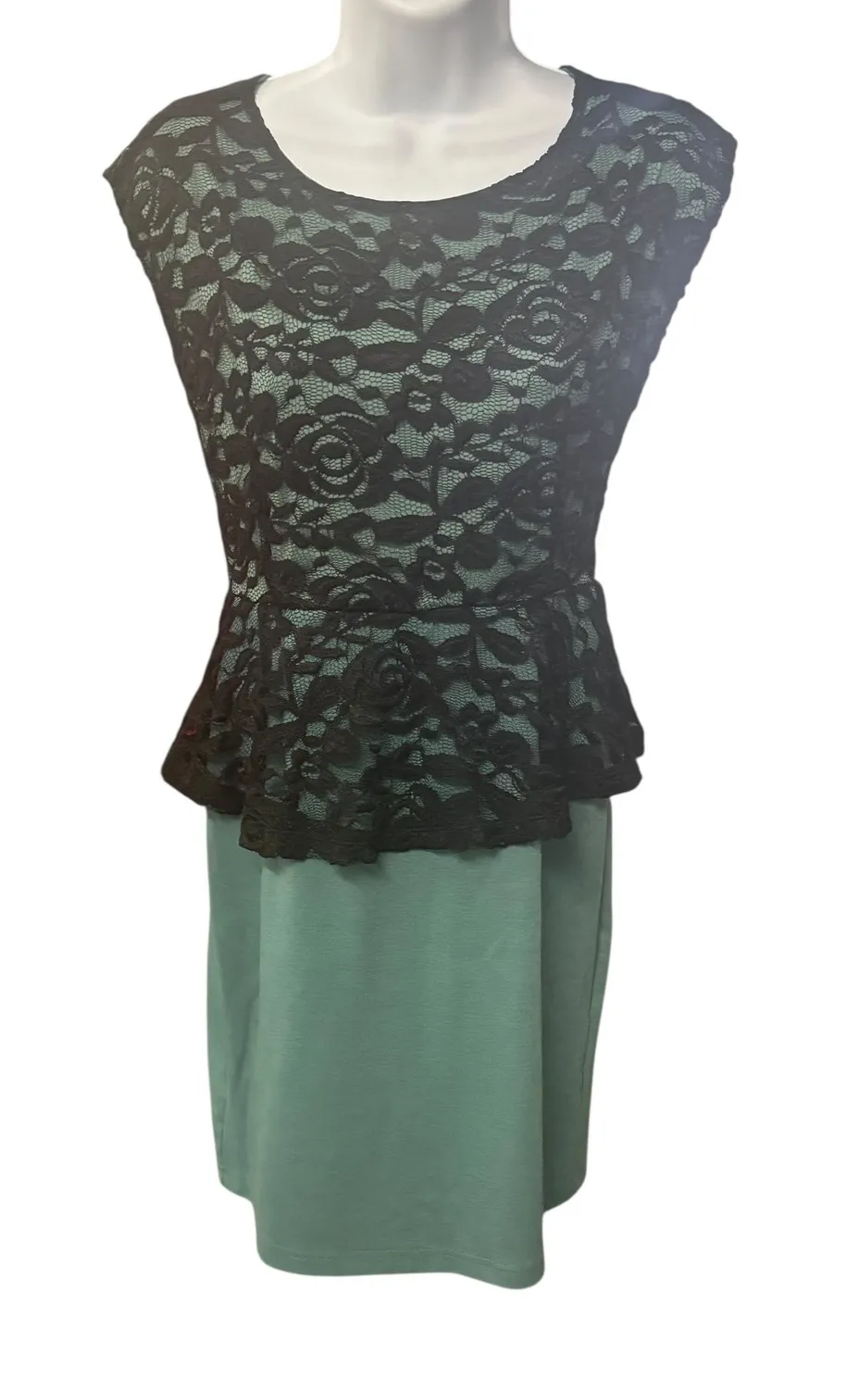 Elegant and chic, a stunning dress featuring a sophisticated design. The dress showcases a black lace peplum top, creating a flattering silhouette with its delicate floral pattern. It's paired with a sleek, green sheath skirt, offering a stylish contrast and a modern touch. The dress is fully lined in green and has a round neckline. Style: Sheath, Pencil Dress Dress Length: Knee Length Color: Green Department: Women Sleeve Length: Sleeveless Pattern: Floral Occasion: Party/Cocktail, Business, Workwear Material: Polyester, Spandex, Lace Neckline: Round Neck Character: Elegant, Girly, Chic, Sophisticated, Modern Fabric Type: Lace Keywords: lace dress, peplum dress, black lace, green sheath dress, cocktail dress, party dress, womens dress, medium dress, kiss and cry, dress