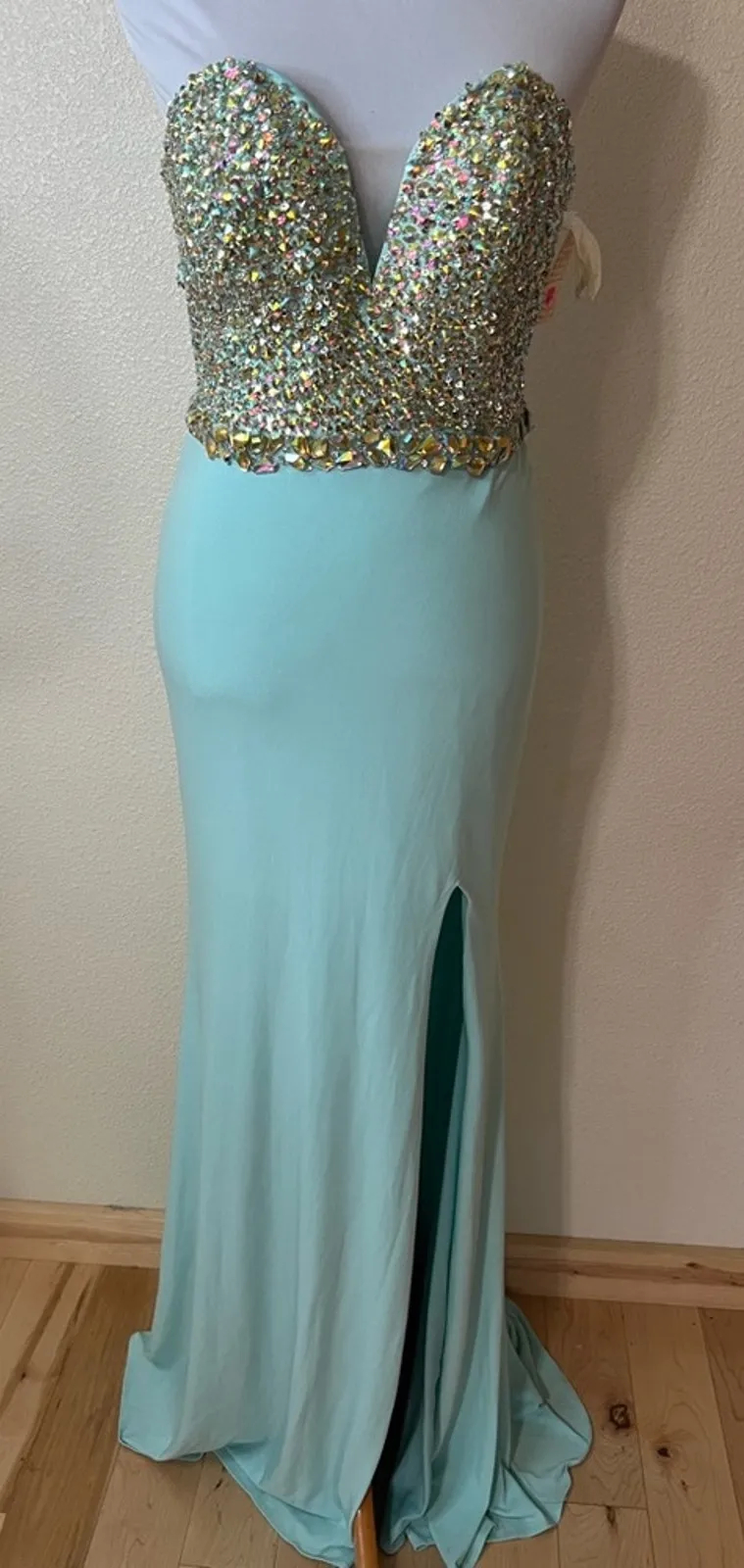 Sweetheart neckline Cut out back Strapless High thigh slit Jersey Lined Small train This is new with tags. It is a floor sample and has been tried on. Minimal wear is to be expected. Only flaw to note is bottom clasp on top of zipper needs to be fixed Formal. Black tie. Prom. Hoco. Homecoming. Wedding guest. Bridesmaid.