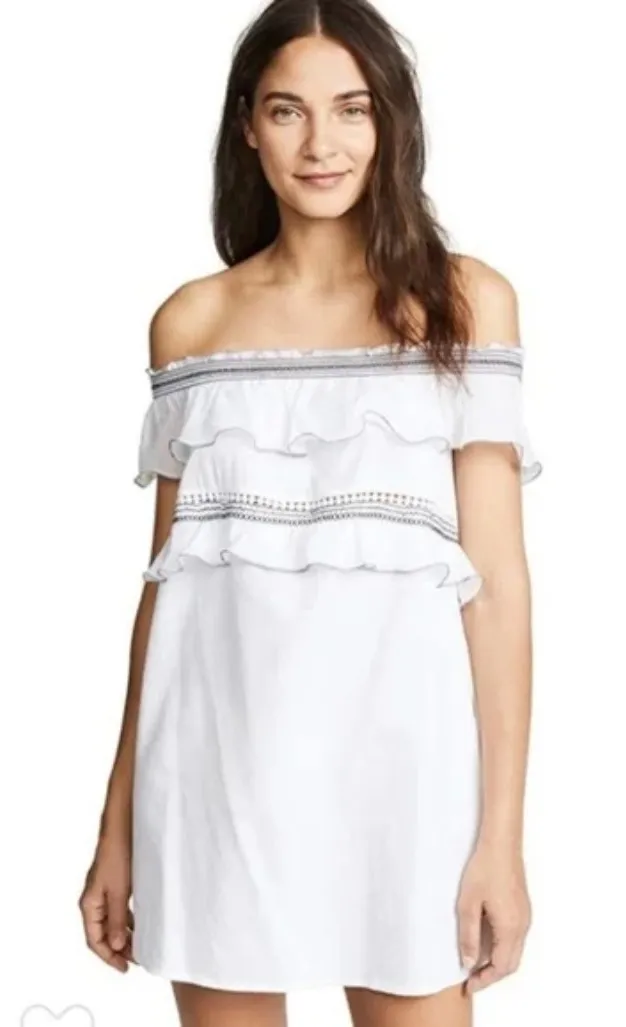 Cotton tiered off-the-shoulder dress breathable airy bohemian style navy detail. Great preowned condition. Brand: Kisuii Color: White/Navy Measurment: bust: 32" length: 29" Summer, bridal, rehearsal dress, spring, flowy, soft, soft glam, cotton, mini dress, tunic, natural fibers, basics, picnic, white dress, white cotton dress, babydoll dress, whimsy, cottage, cream mini dress, summer vacation, cream, nautical, ruffle