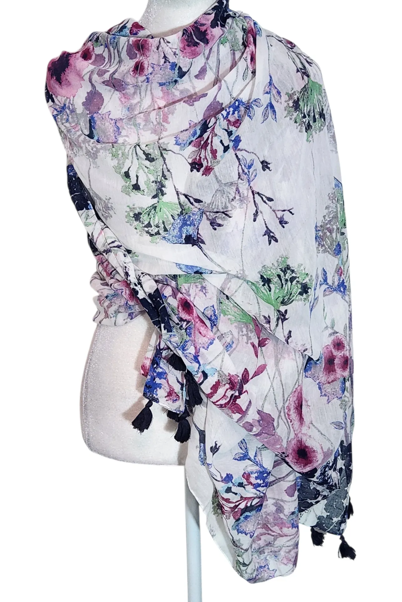 Kitara elegant floral print scarf with corner tassels and shades of pink, purple, green, and navy. S... Show more