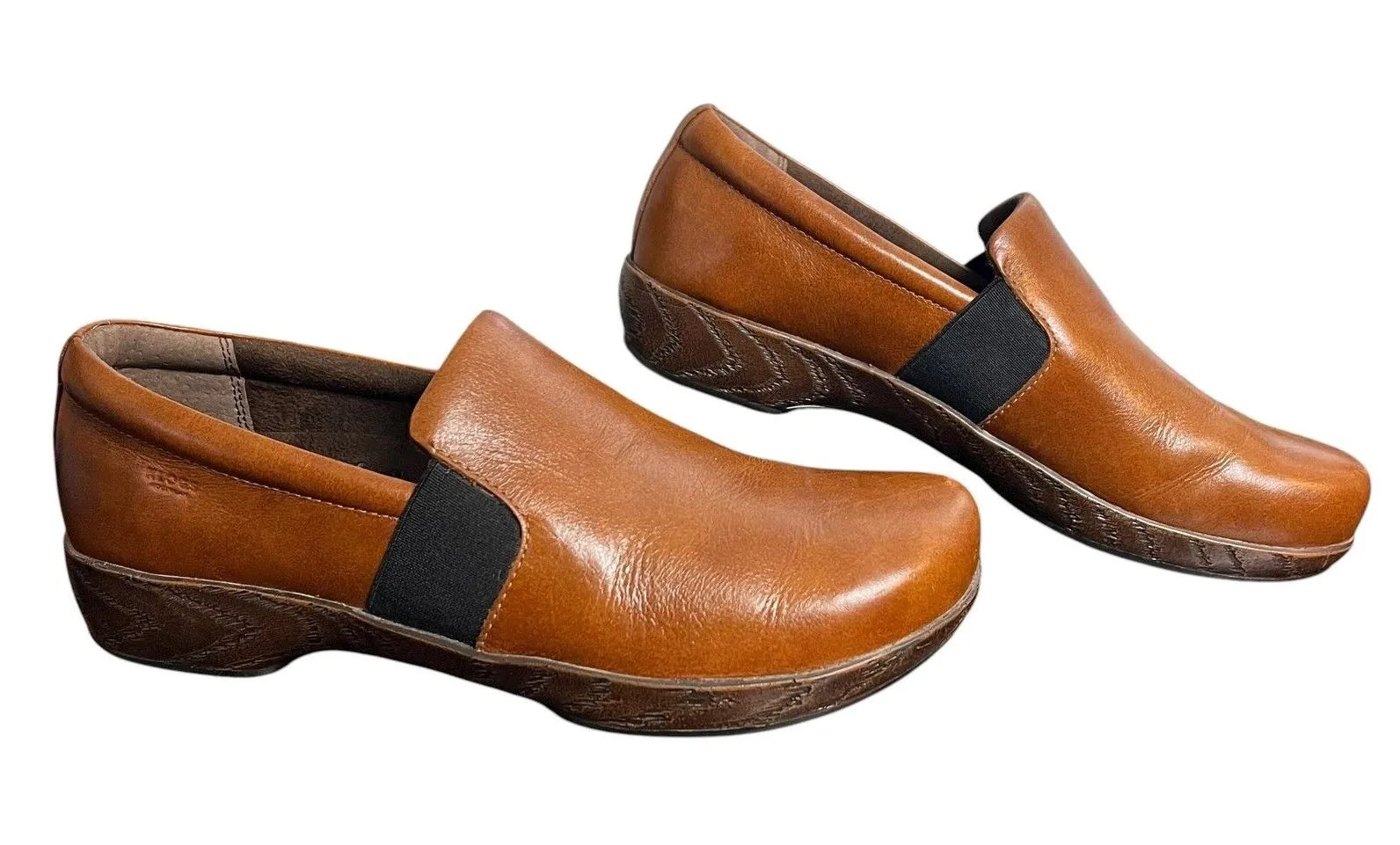 Brand: Klogs Footwear Style: Tucker slip-on clogs with closed back and elastic gore panels. Color: Brown Size on tag: 9.5M Women's US Materials: Leather upper; balance man-made materials. Outsole markings: Slip Resistant, Non-Marking. Details: Cushioned comfort footbed, slip-on design, elastic gore panels for fit, closed-back clog silhouette, low wedge heel, textured slip-resistant non-marking outsoles. Style/Model name: Tucker; internal code on tag: 201801. Country of origin: Made in China.