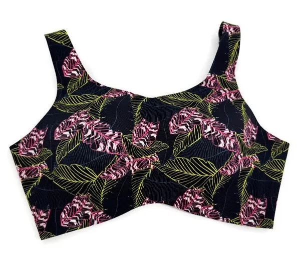 This Knix Catalyst high-impact sports bra features the bold Electric Aloha print with a supportive, compressive fit designed for high-intensity workouts. Made for running, HIIT, and training, it offers strong support while remaining comfortable and breathable. The wide straps and smooth stretch fabric provide stability without digging in, and the pull-on design makes it easy to wear. Bright tropical leaf pattern on a black background. Size: 7+ (see size chart in pics) best for XL E/DDD & Lg and XL F High-impact support Pull-on sports bra Smooth stretch performance fabric Electric Aloha print Color: Black with pink and green tropical leaf pattern Condition: Like new. No flaws noted. Clean and well cared for. SKU: 2413 Tags: Knix sports bra, Knix Catalyst, high impact sports bra, Electric Aloha, running sports bra, workout bra women, supportive sports bra, gym bra, training bra, large bust support