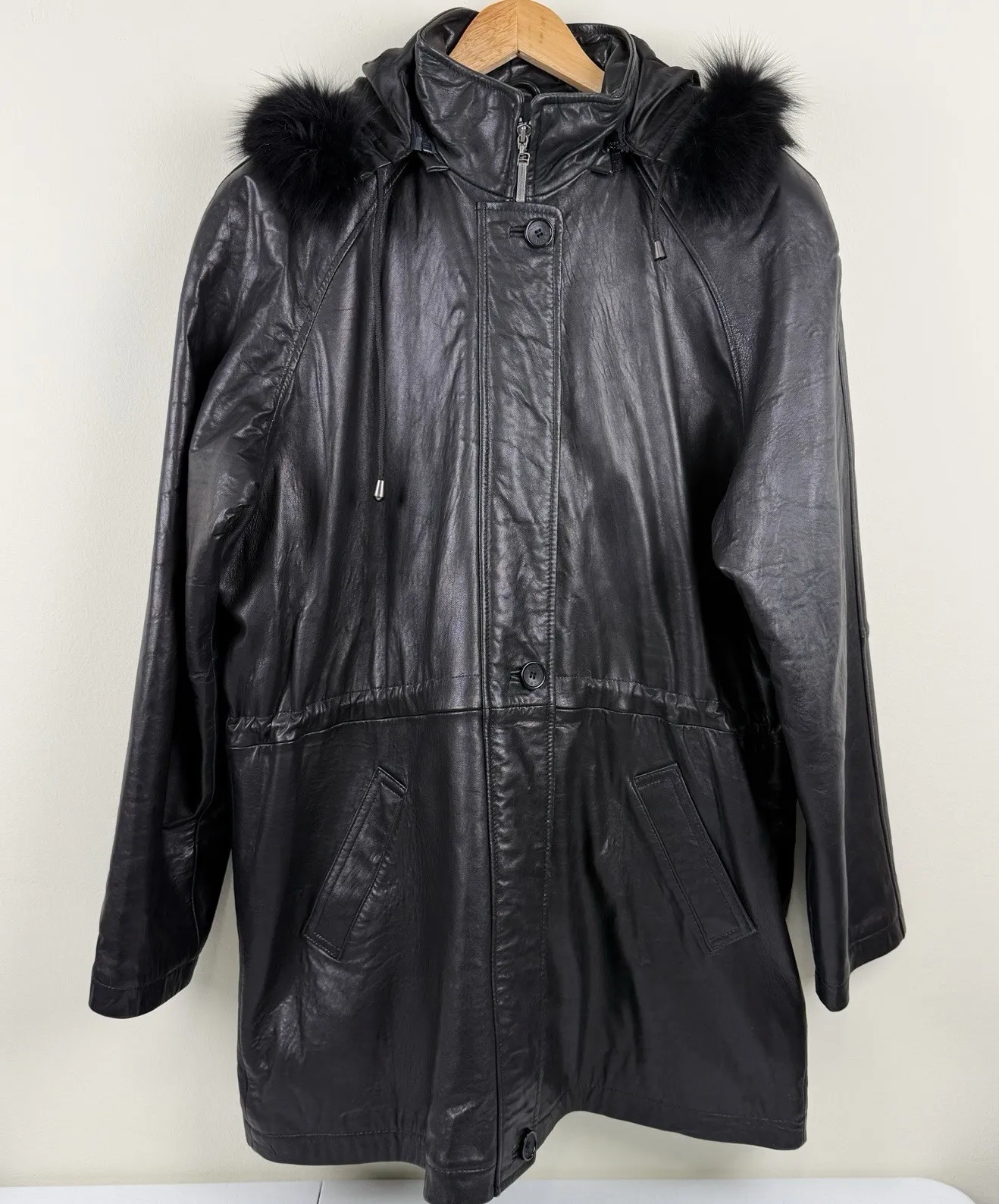 The Knoles & Carter Downtown Black Leather Coat in XL size is a stylish and sophisticated overcoat perfect for various occasions like parties, casual outings, or business meetings. Made from high-quality Italian lambskin leather with a luxurious fur trim hood, this long sleeve coat exudes elegance and class. The classic solid black color, zip and button closure, and regular fit make it a versatile piece for the winter, fall, and spring seasons. Ideal for women looking for a chic and timeless outerwear option.