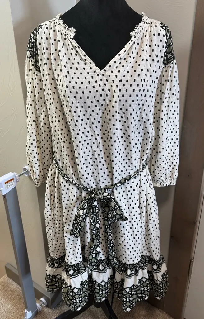 Knox Rose Black White V-Neck Embroidered Long Sleeve Tie Detail Dress Milkmaid Midi Knee Length XXL... Show more