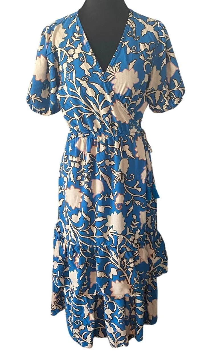 Beautiful Knox Rose boho floral midi dress in a vibrant blue and cream botanical print. True wrap bo... Show more