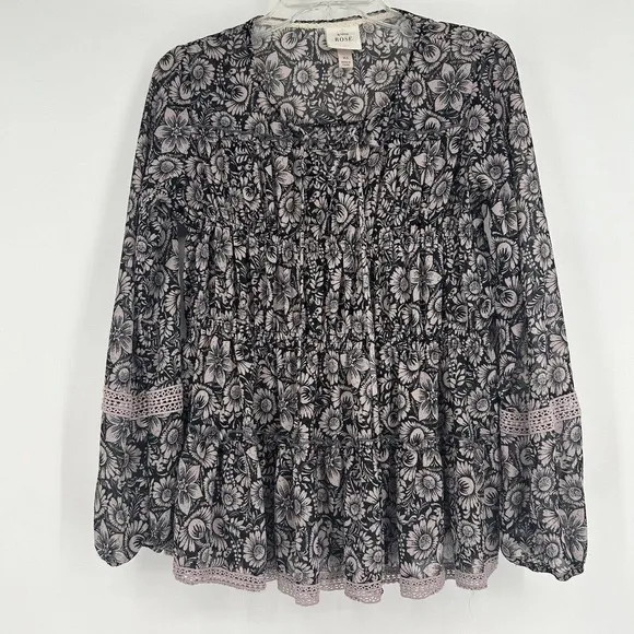 Knox Rose Boho Floral Lace Up Top Black Pink Long Balloon Sleeves Crochet XS - $9 - From Jenna