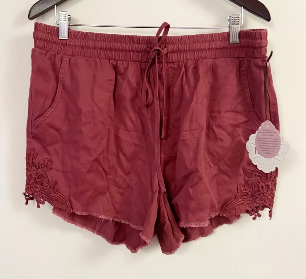 Brand new. Burgundy. Cut off raw hem. Drawstring elastic waist. Embroidered floral lace hem. Pockets... Show more