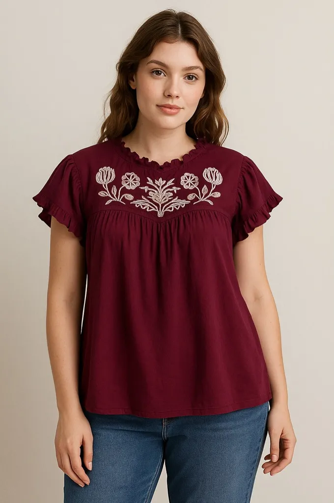 Romantic and boho-chic, this Knox Rose embroidered peasant blouse in a rich burgundy hue features beautiful white floral embroidery, ruffle sleeves, and a flowy, relaxed fit. The lightweight woven fabric and detailed yoke design create an effortless, free-spirited silhouette that flatters and adds instant style.