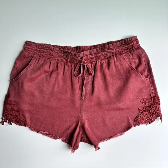 These Knox Rose high-waist shorts feature a stylish burgundy color with lace detail for an elegant s... Show more