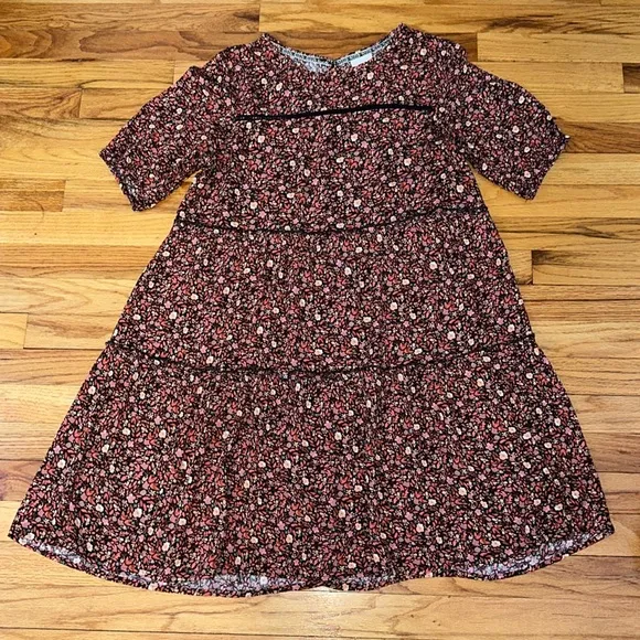 Cute babydoll silhouette dress features orange and pink floral pattern on black base and embroidered... Show more