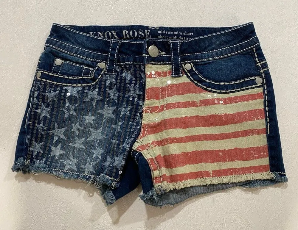 Knox Rose mid-rise denim shorts featuring a patriotic American flag print with sequin detailing on b... Show more