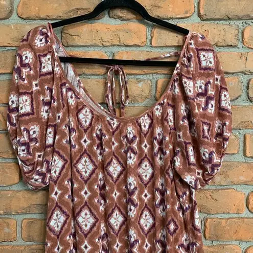 Dusty rose pink, purple, and white colors Scoop neckline Tie back Short puff sleeves Tiered Midi len... Show more
