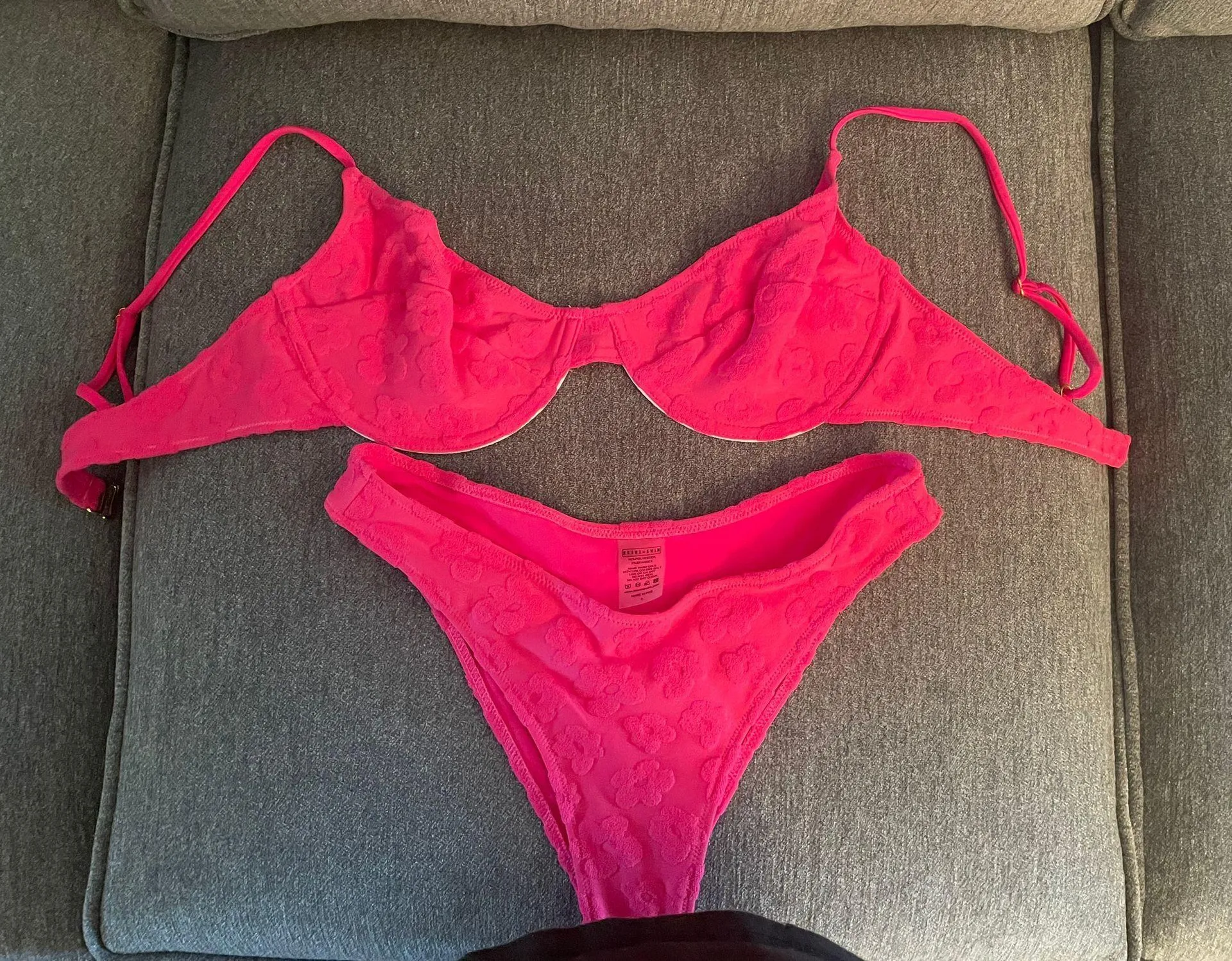 Brand new, never worn! Panty liner still in bottoms. This swimsuit is super cute but I didn’t like the color on me and missed the return deadline. Top is a medium Bottoms are size small Open to offers