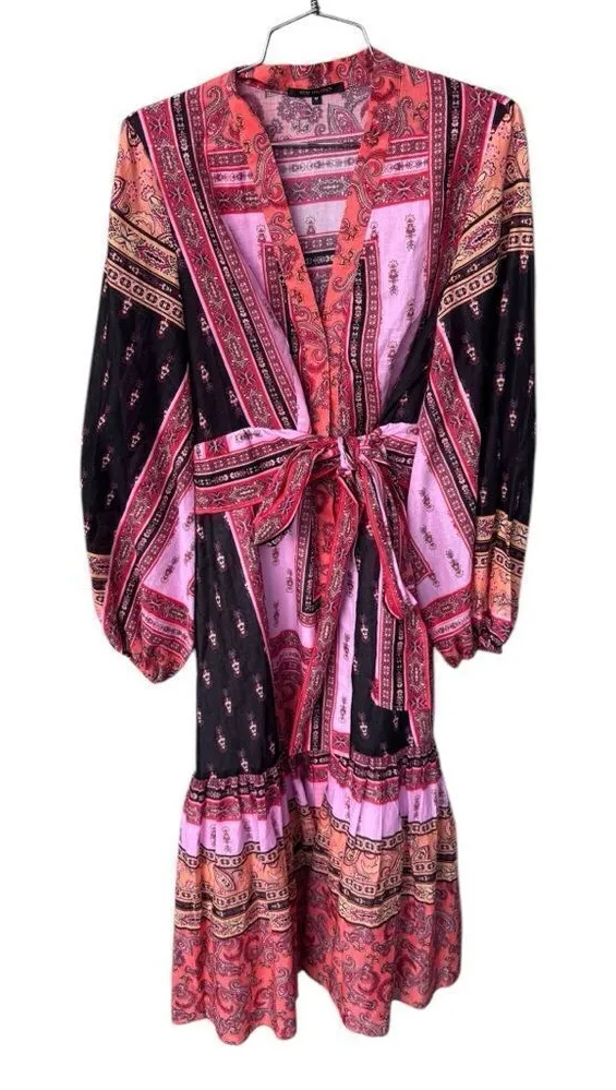 Kobi Halperin Diana Paisley Scarf Print Long Sleeve Button Front Midi Dress. V neck dress with tie waist sash and tiered ruffle hem. Black, pink, and orange pattern. Lined. Color is "Melon Multi." Size medium Excellent preowned condition 19.75” pit to pit 15.75” waist 47” length 2272-19