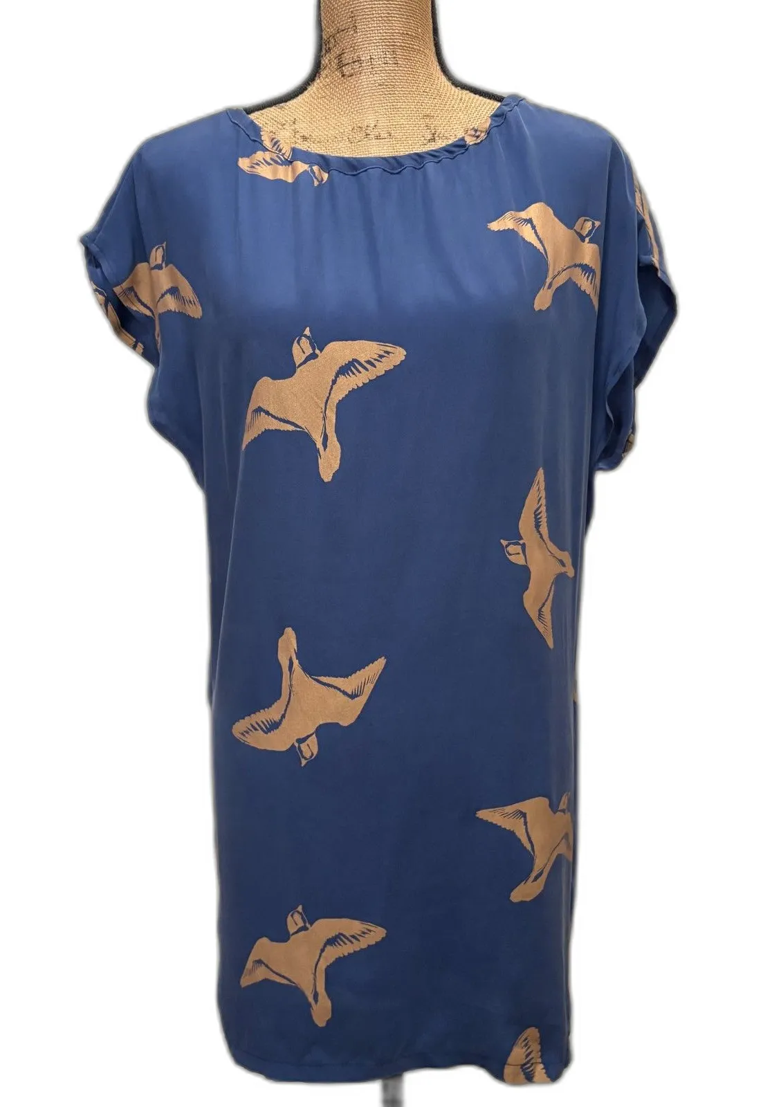 Koch 100% Silk Dolman Mini Dress Blue Gold Bird Novelty Print Twee Size Medium Gently used conditio... Show more