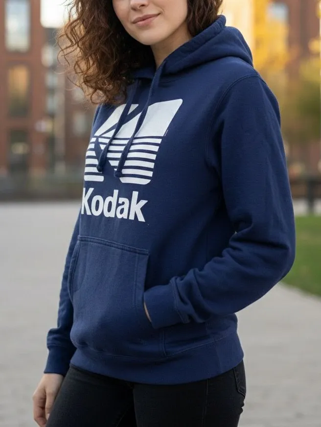 Authentic licensed Kodak logo pullover hoodie from Port & Company. Perfect for photographers, film enthusiasts, and fans of retro/nostalgia street style. Features: Drawstring hood, front kangaroo pocket, ribbed cuffs and hem. Excellent pre-owned condition. No stains, rips, or pilling. Graphic is vibrant. Great piece for a casual, street-wear, or vintage aesthetic look. A popular licensed graphic tee/hoodie style.