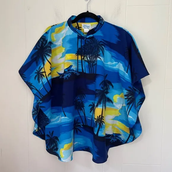 Embrace the spirit of summer with this vibrant Kole Kole Hawaiian poncho pullover coverup. The colorful and beach-themed design make it a perfect addition to your summer wardrobe. The top features kimono sleeves and a V-neckline with hook & eye closure, making it a stylish and comfortable option for women of all sizes. The pullover closure adds convenience, making it easy to throw on over your swimsuit before heading to the beach. Made from high-quality polyester, this top is durable and perfect for the warm summer season. The unique pattern and design make it stand out from the rest, making you the center of attention wherever you go. Perfect for any summer occasion, the Kole Kole Hawaiian poncho pullover coverup is a must-have for any fashion-forward woman. Excellent pre-owned condition - There are holes on each side for a belt to cinch the waist, NO BELT INCLUDED One Size Fits All Please check measurements to ensure correct fit Approximate measurements: Length 26 inches Width 34.5 inches Armpit to armpit 22 inches Please see photos Style: Vintage Retro Easy Casual Beach Beachy Coastal Grandma Vibe Vacation Travel Resort Wear Palm Trees Sunset Ocean I love saving clothes that have been discarded and finding them new homes. I ship as soon as I can, and use recycled materials/minimal plastic in my packaging. I hope you love your new-to-you item! ✨