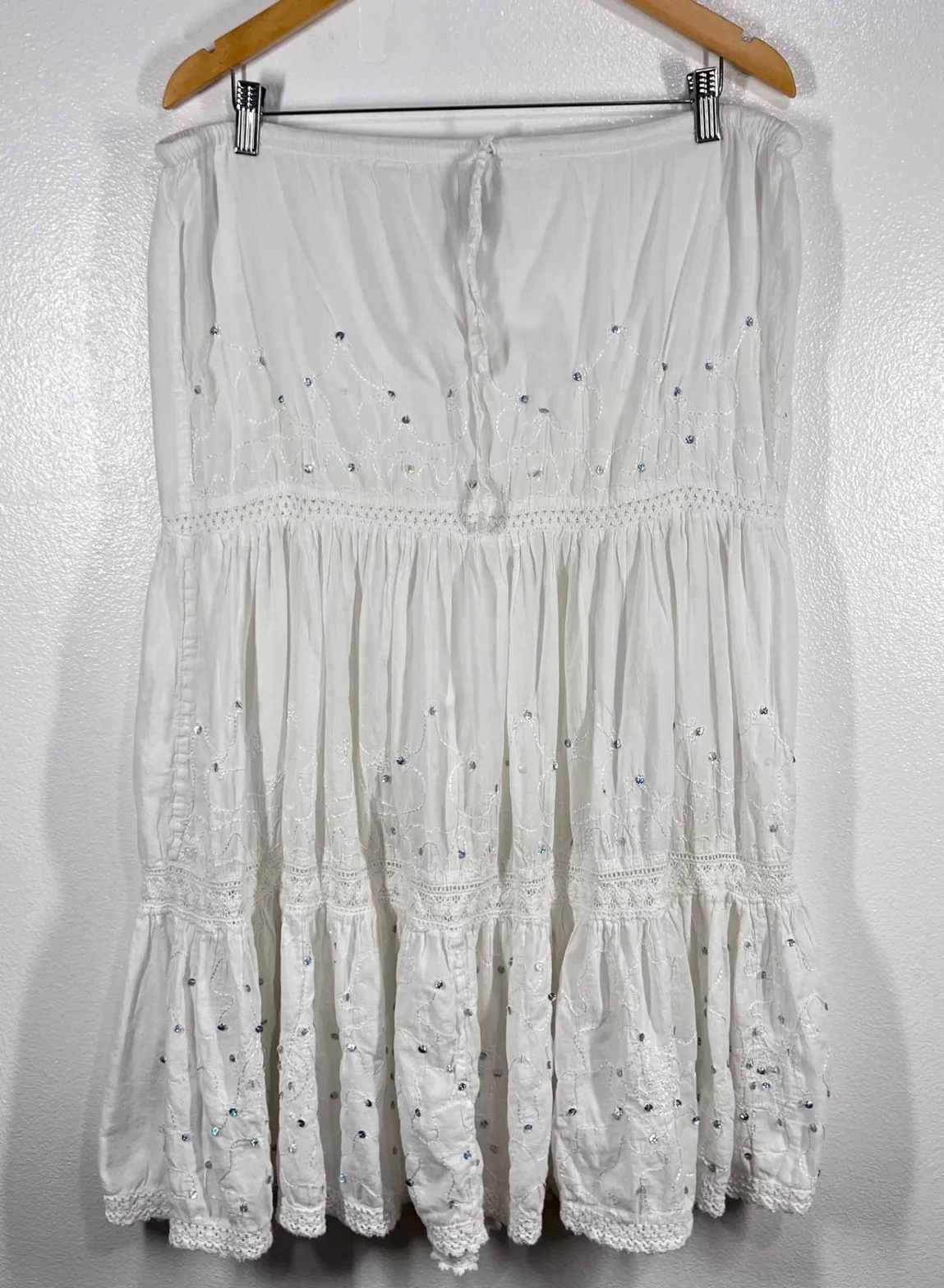 Type: Skirt Department: Women Style: A-Line Skirt Length: Midi Color: White Material: Cotton Pattern: Solid Accents: Embroidered, Lace Fabric Type: Cotton Features: Lightweight, Elastic Waist Character: Bohemian, Beach, Summer, Festival, Vacation Closure: Drawstring Occasion: Casual, Travel, Party/Cocktail Keywords: white skirt, cotton skirt, embroidered skirt, tiered skirt, bohemian skirt, beach skirt, cover up skirt. I ship out items Monday - Friday. • All items come from a pet-free, smoke-free home. • Please compare the measurements to something you already own. Thank you for visiting my store.