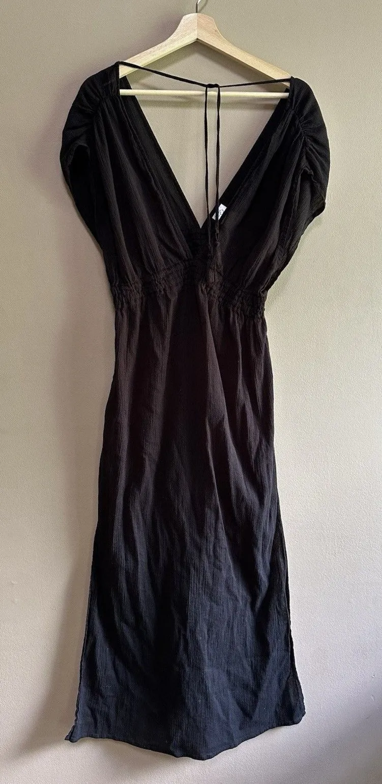 Side slits. No discoloration. Black just doesnt always photograph well. This item is in excellent p... Show more