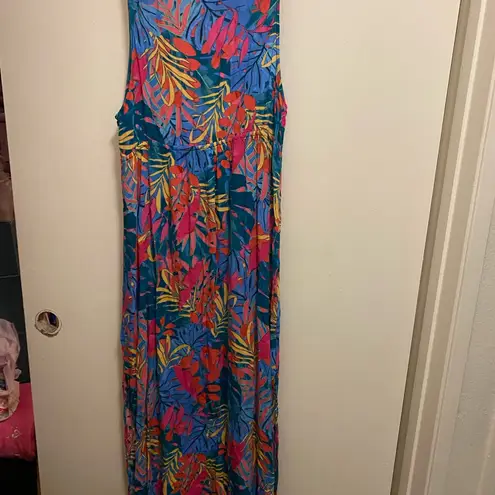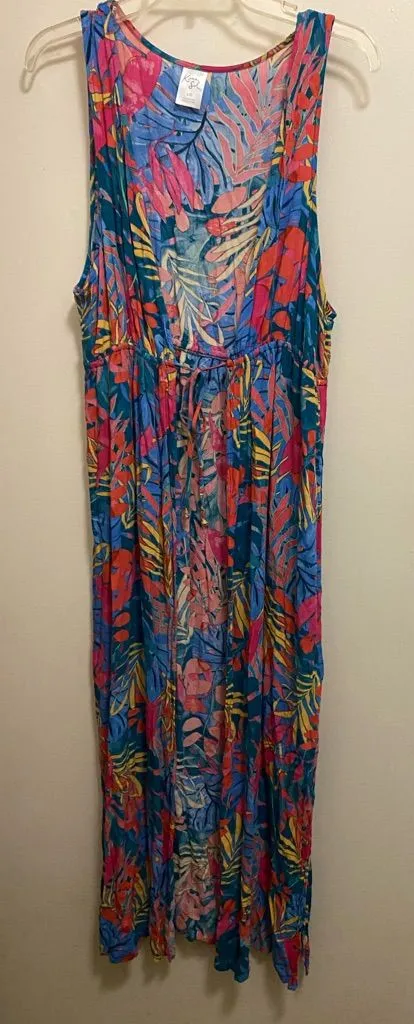 Vibrant swimwear with a tropical print. Features a mix of blue, pink, and green hues. Perfect for beach days. Great condition with no stains or damages Pit to pit across is 20” across for bust measurement of up to 40” Ties above waist Length 54” 100% Rayon
