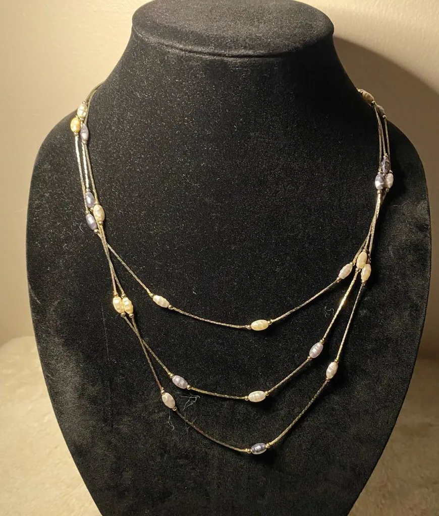 Elegant faux pearl necklace 3 strand Chain is silky smooth, shiny finish Faux gray & white baroque p... Show more