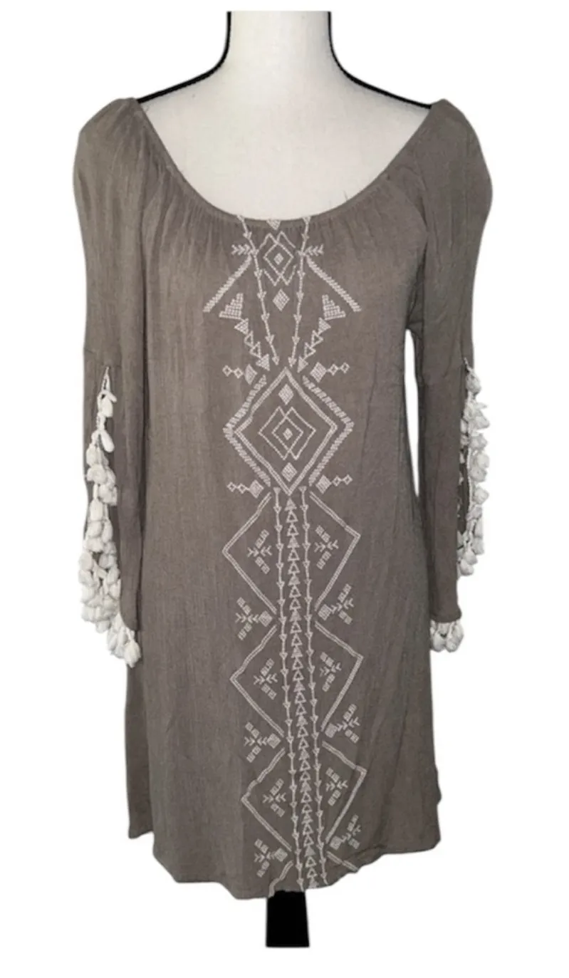 Kori America Neutral Off the Shoulder Tassel Tunic Bohemian Dress Size Large In great condition!... Show more