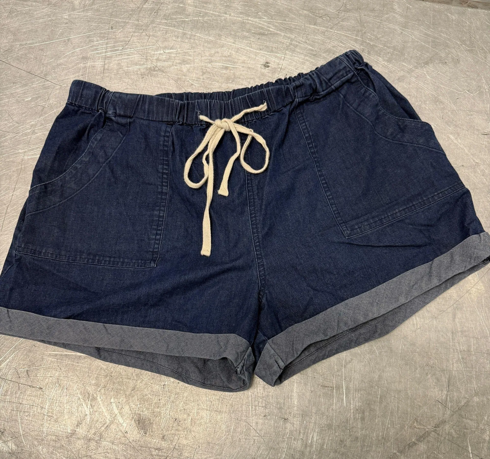 Women’s blue lightweight cotton blend shorts with a medium rise and cuffed hemline. Two pockets in front and in back, a slightly stretchy waistband with the tie closure in front. In excellent condition, size large. Hand wash only.