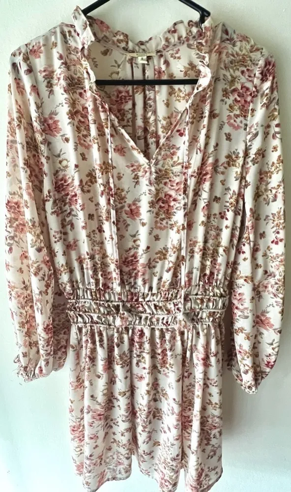 Super cute NWOT, Kori America floral dress has light pink details. Could probably fit a medium! Open neck has a tie. Ruched in the middle. Material polyester, approximately measures 17in pit to pit but stretches to 19in. Length is 36in.