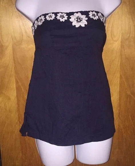 This is a navy blue tube top with white and silver flowers across the top. It is is fantastic condit... Show more