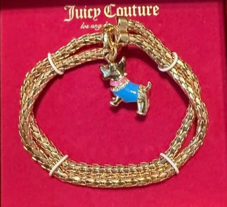 Elegant gold chain bracelet with a charming dog pendant. Perfect accessory by Juicy Couture.
