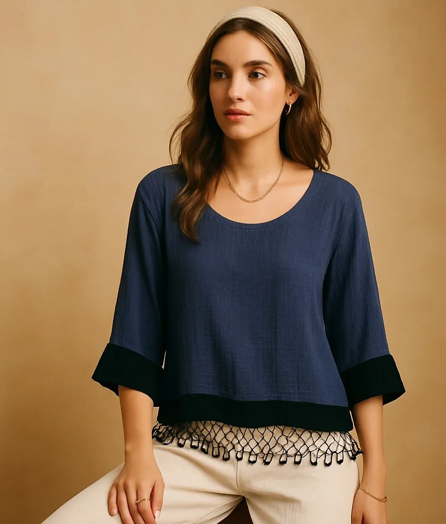 Discover effortless elegance with this striking Krazy Kat tunic top. The textured blue fabric drapes beautifully, creating a flattering silhouette that moves with you. Velvet trim accents the sleeves and hem, adding a touch of sophisticated texture, while the eye-catching beaded fringe along the bottom hem sways with every step, creating a captivating visual effect. Perfect for a casual brunch, a relaxed evening out, or a stylish vacation ensemble. Measurements: • Bust: 23 in • Length: 26 in Type: Blouse Department: Women Style: Tunic Material: Rayon, Polyester Neckline: Round Neck Sleeve Length: 3/4 Sleeve Sleeve Type: Flared Sleeve Pattern: Solid Accents: Beaded, Fringe Features: Contrasting Trim, Keyhole Neck Fit: Relaxed Fabric Type: Rayon Occasion: Casual Closure: Pullover Season: Spring, Summer, Fall Keywords: tunic, beaded, fringe, velvet, textured, blue, women's, plus size, casual, evening, boho, chic, designer, unique