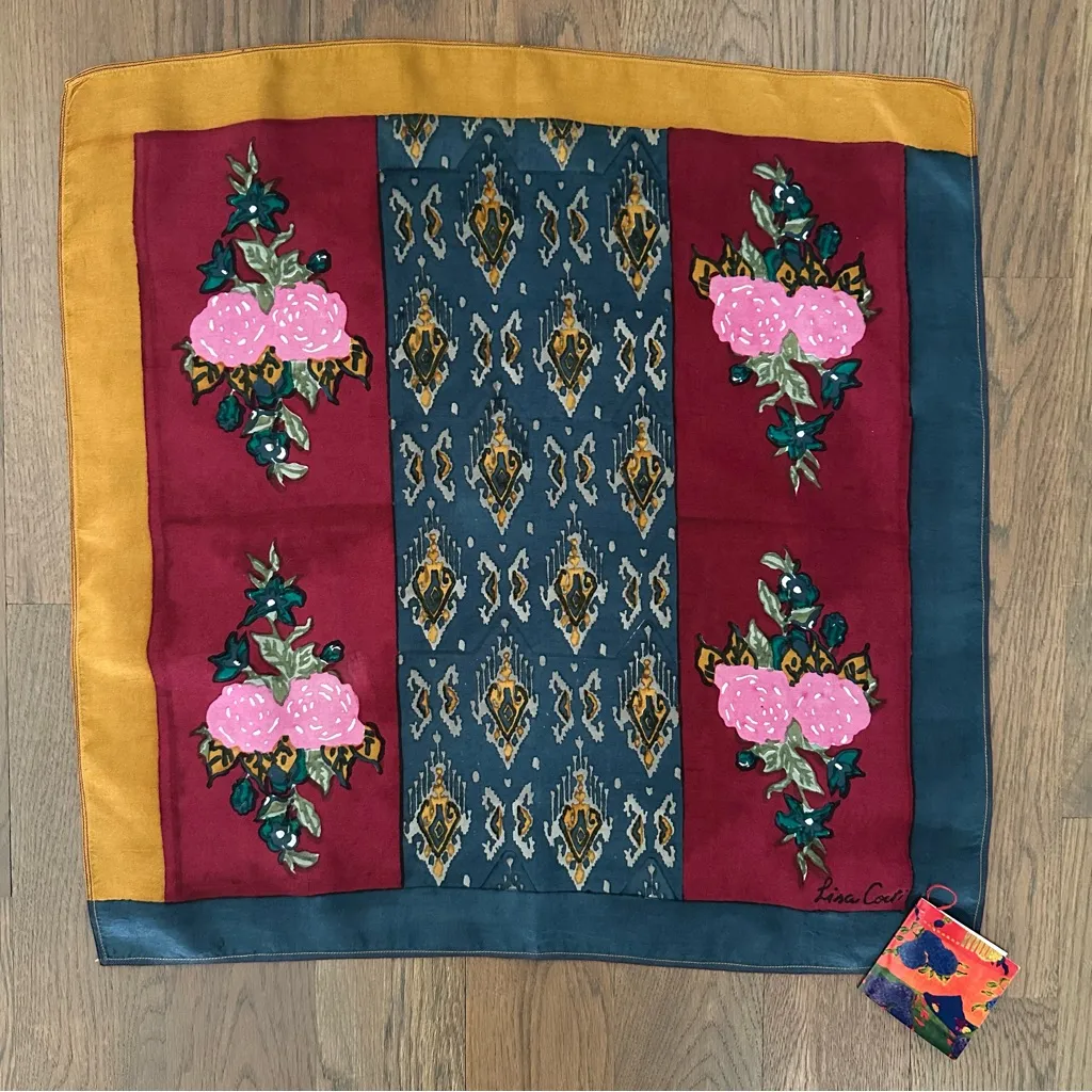 NWT Lisa Corti silk pocket square scarf. In blue, goldenrod, pink, green, and grey floral and geometric print. Measures 50 x 50cm, or 19.685" x 19.685". The Lisa Corti pocket square is crafted from 100% habutai silk and blockprinted by hand. Versatile in nature, this sophisticated accessory can be worn as a bandana, wrist scarf, or hair garment, elevating any outfit. Cut using pure silk, with a signature Lisa Corti heritage design and modern border. This timeless accessory is suitable for all ages and seasons. Made in India. 100% silk. Dry clean only. Brand new with tags, never worn. No trades; bundle discount available.