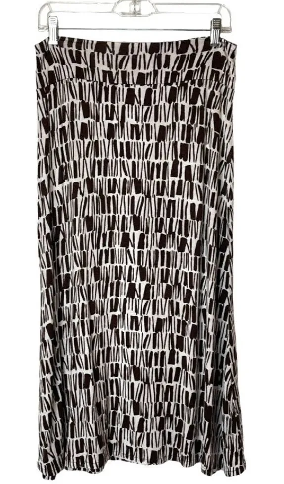 This midi skirt by Krimson Klover is in excellent condition. It is in a brown & ivory color in an allover geo print. The skirt features: a comfortable wide stretch waistband, knit fabric, midi length with pull on styling and rayon and spandex blend. Condition: Excellent Color: Brown/Ivory Material: Rayon/Spandex Measurements: waist side to side 13.5 in, length 31 in, designer, casual, classic, colorful, velvet, velour, hippie, peasant, boho, bohemian, trendy, stylish, maxi, midi, long, stretch, silver, comfortable, comfort, Geo, Modest, Modesty, geometric, stretch, minimalist, jersey, comfy,