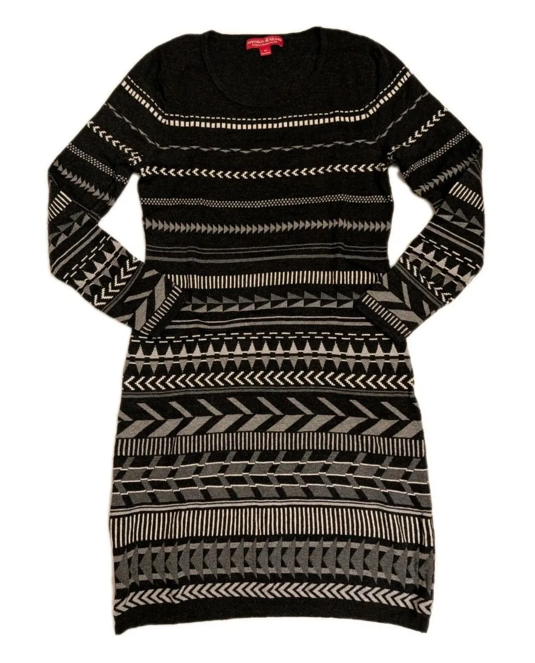 Krimson Klover Merino Wool blend black, gray and white Sweater Dress, women's Size Medium. One side zipper pocket towards the bottom hem. Fair Isle Cabin Fisherman Outdoor Utility Preppy Hiking