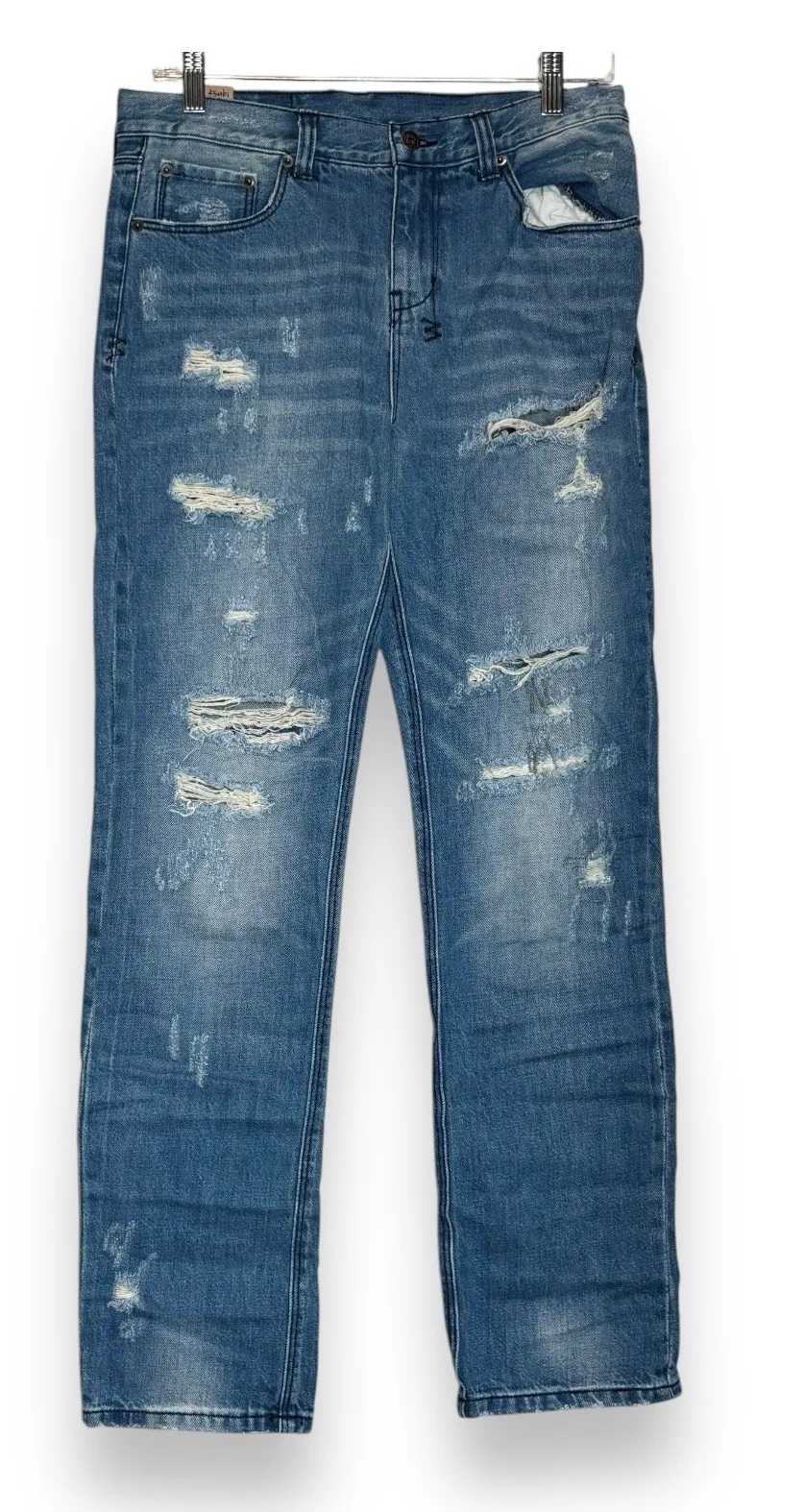 Elevate your casual style with these KSUBI Boyfriend Jeans in a cute blue color. These jeans feature a relaxed straight leg fit, perfect for a laid-back look. The fabric type is denim, and the garment care is machine washable. The closure is a zip and button combination, making it easy to put on and take off. These jeans have a 5-pocket design, and the accents include buttons, zippers, and rips for a distressed look. They are available in size 26 and are suitable for all seasons, whether it's winter, summer, fall, or spring. The KSUBI Boyfriend Jeans are a great addition to any wardrobe, and the 90s theme is perfect for a trendy and vintage-inspired look.
