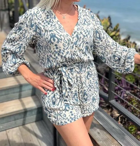Stylish blue and white patterned romper. Features a tie waist and long sleeves. The Evereve Roan & Ryan Long Sleeved Belted, Lined Shorts Romper in size L is a stylish and comfortable one-piece outfit perfect for travel and casual occasions. Featuring a geometric blue pattern, long balloon sleeves, and a V-neckline with button closure, this romper has a bohemian vacation vibe. Made from rayon fabric, it includes stylish accents such as a belted waist, puff shoulders, and pearly buttons. With a 2-inch inseam and a lined interior, this romper is both trendy and practical for the summer and spring seasons. Hand wash only to maintain its quality.