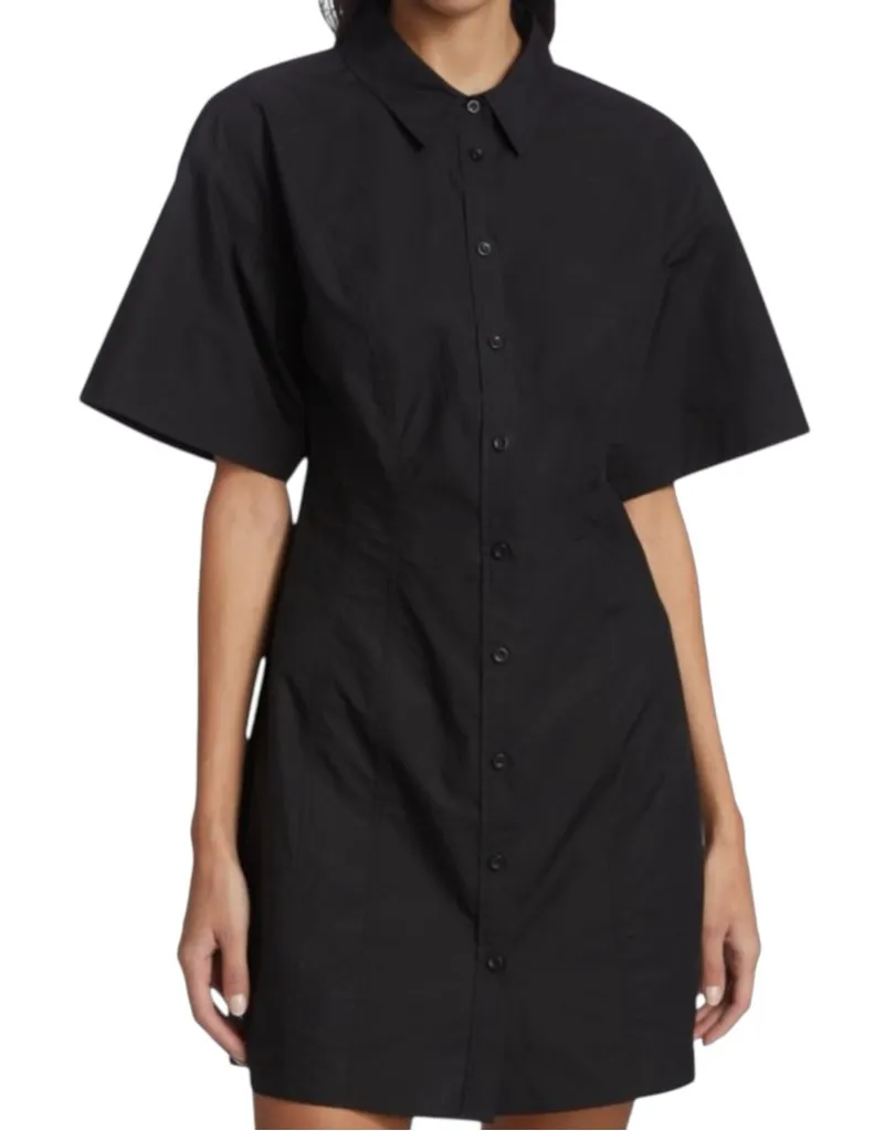 Chic black mini dress with button-up front. Short sleeves and tailored fit. Ideal for versatile styl... Show more