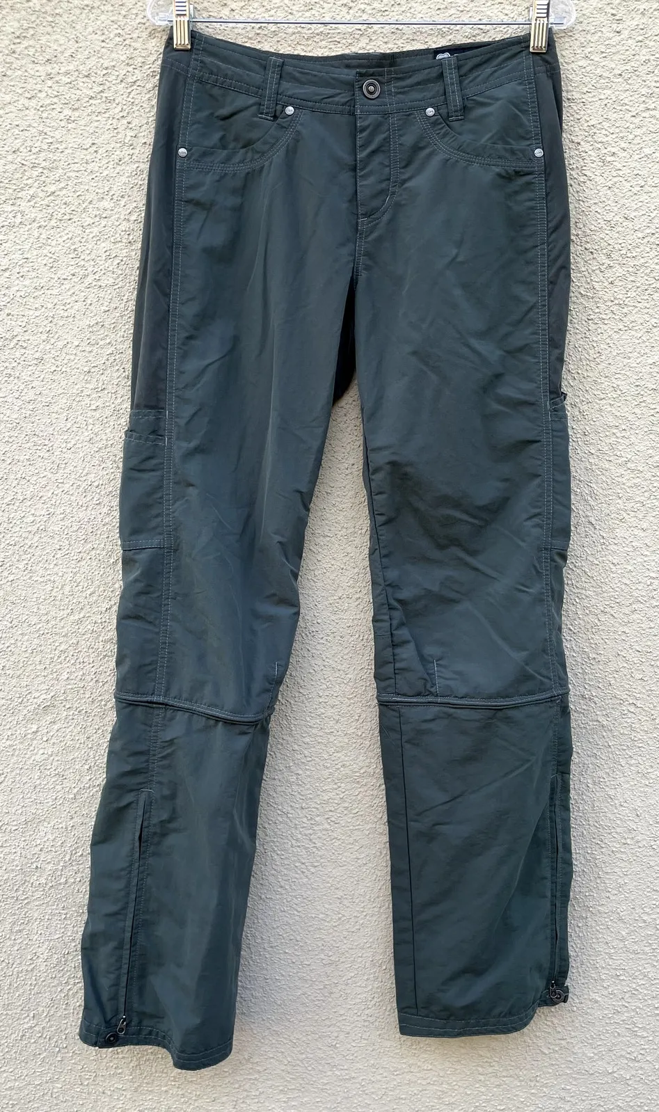 Green convertible pants/shorts by Kuhl Mountain Culture, size 6. Lightweight cotton/nylon blend, elastic panels at waist, bottom third zip off completely to convert into Bermuda shorts, and lower legs have zips at ankles, button/tab inside to secure when rolled, front & back pockets. Good condition with light wear and no stains or flaws. Laying flat measure about 15.5" across waist, 10" rise, 32" inseam, 8.5" leg opening. I always pack carefully and ship out by next business day!