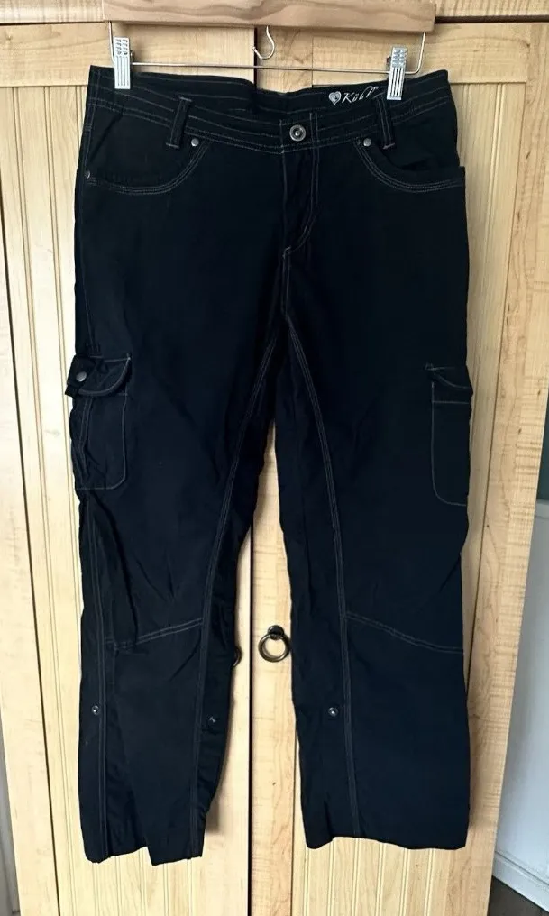 These Kuhl Women's Black Splash Roll Up Pants are lightweight, breathable, and quick-drying, making them perfect for travel and casual occasions. The mid-rise cargo style pants feature a zip and snap closure, with accents like a zipper and logo detail. Made of a blend of nylon, spandex, and cotton, the pants offer comfort and stretch, with convenient pockets for storage. The solid black color and straight leg design make them versatile for the summer, fall, and spring seasons, while the machine washable fabric ensures easy care. Perfect for nature-inspired living, these Kuhl pants are a stylish and practical choice for outdoor activities.